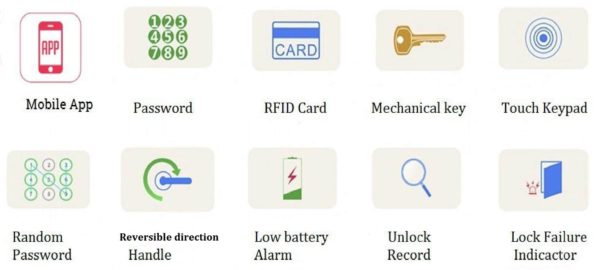 Unlock method: BLE App, M1 Card, Passcode, Wristband, or key